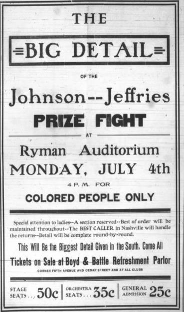 The match between Jack Johnson, an African American, and James Jeffries, a white former heavyweight boxing champion, was hailed as "The Fight of the Century." Johnson, to the surprise of the white media, won the match handily. The advertisement . . . shows that the Ryman Auditorium was used by African Americans for a number of events during the period of segregation.